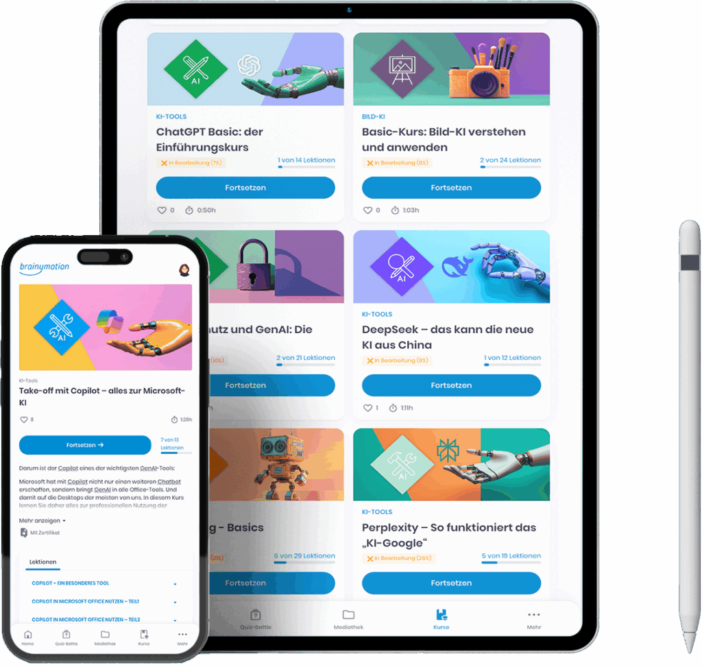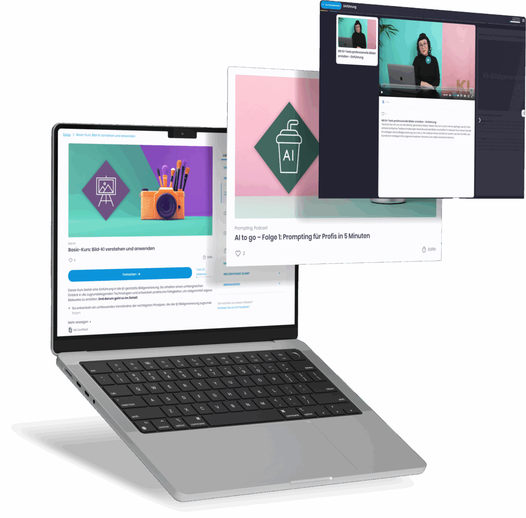 Entdecken Sie KI- Tools wie ChatGPT, Perplexity, Copilot, HeyGen, Midjourney und viele mehr. Meistern Sie Ihr erstes Prompt-Training, absolvieren Sie interaktive Übungen und erwerben Sie kompaktes Wissen rund um Datenschutz, KI-Recht und den EU AI Act – in leicht konsumierbaren Formaten wie Podcasts oder Videosequenzen.